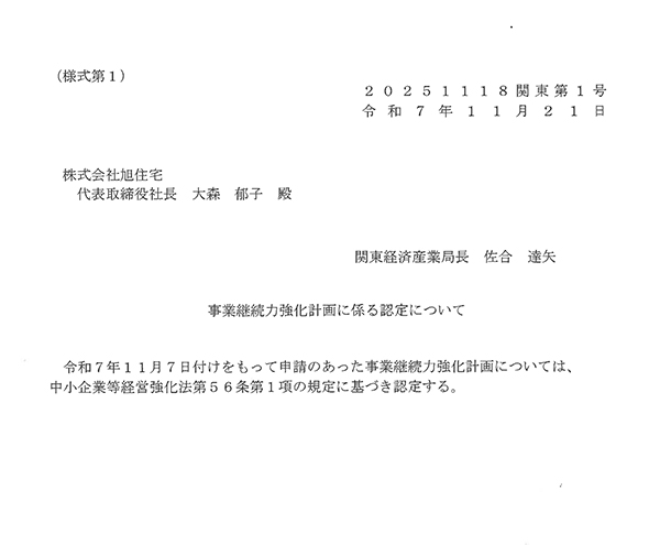 このたび旭住宅が提出を行った「事業継続力強化計画」が、11月21日付で、経済産業省関東経済産業局長より認定を受けたましたのでご報告いたします。